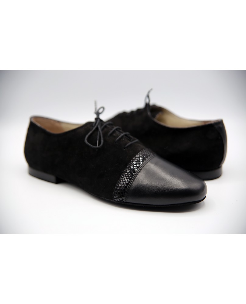 Beautiful combination of plain black suede, printed black suede and black nappa with an original transversal line at front of shoe. An exclusive model designed by Handan Tanir. Heel 1.5 cm on photos but available in 3 cm and 4 cm.