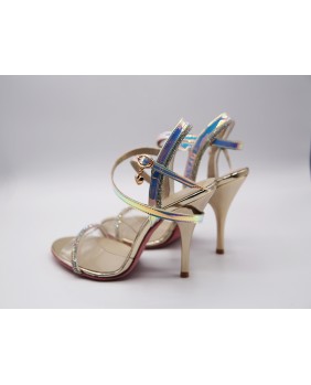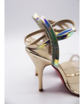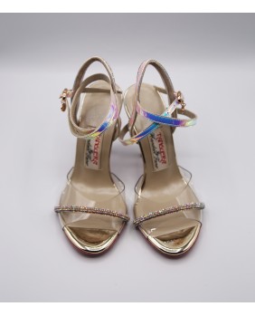 Model in iridescent mirror patent and transparent soft material that reveals the whole foot. Strass line at the front and along the back strap. Light pink sole and shinny gold heel of special 9 cm on photos but available in 7 cm, 8 cm and normal 9 cm. This model is declined in all patent colors and transparent material and can be edged like our NT015 model.