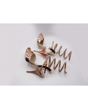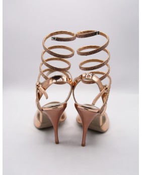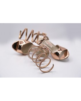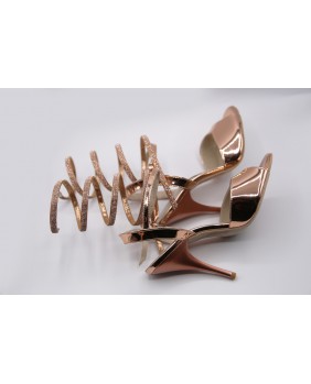 Magnificent model from the new collection created by Handan Tanir composed of copper mirror patent and rhinestone bands as a spring that rolls around the leg. Classical front shape and single strap on the ankle with open back part. Copper heel and light sole, available in all heel heights.