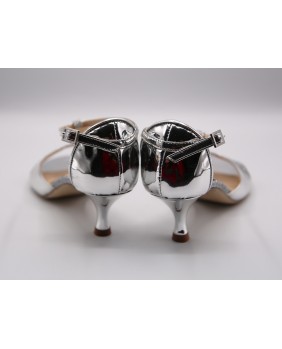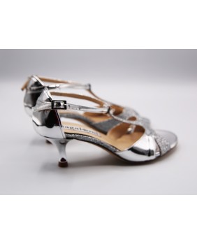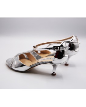 Closed cage model in silver mirror patent and matching glitter. Thin T strap and front made of interwoven straps with both materials. Small shiny silver heel and leather sole. Available in all heights and with a suede sole too.
