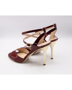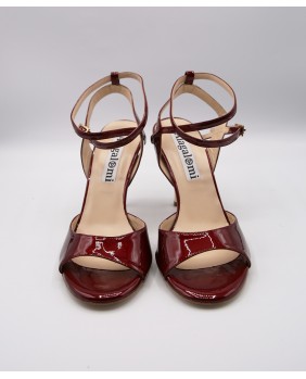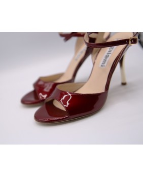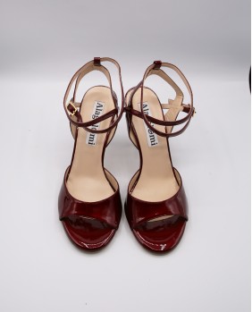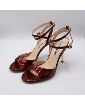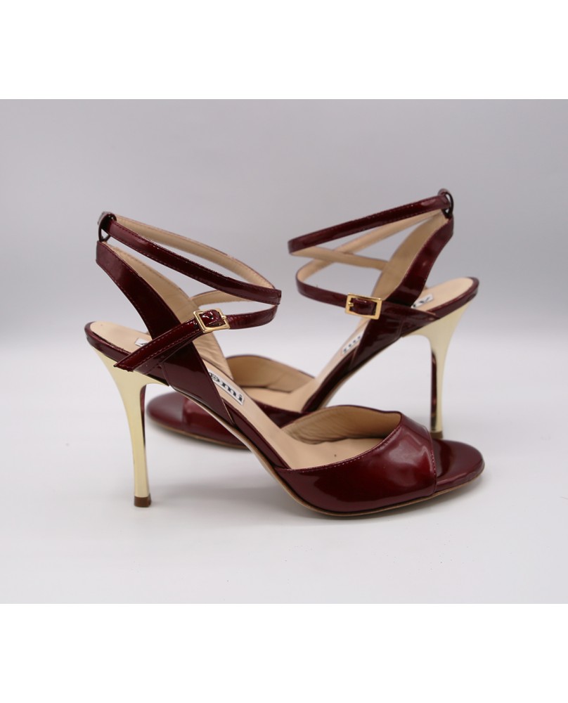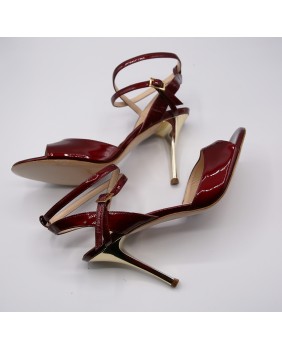 Beautiful Maia model in shiny burgandy pearly patent. A very original material with beautiful reflections. Open back and double-wrap strap for this classic and elegant model with a mirrored gold heel.
