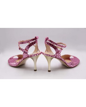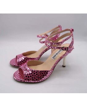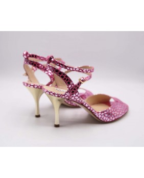 Beautiful Rosa model in shiny light pink leather with round bubble print. A very original material very luminous, perfect for summer or elegant evenings. Open back and double-wrap strap for this colorful and elegant model with a mirrored gold heel.