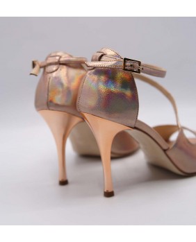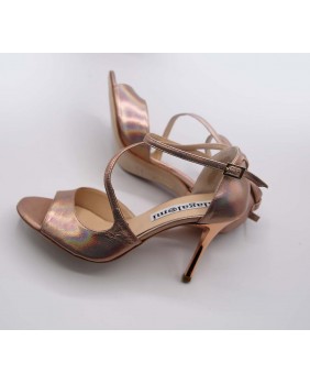 Closed back model with very original shape in iridescent copper leather. Ankle and diagonal foot straps, copper leather and pump style make up this model very classic and elegant. Leather sole but available in suede.