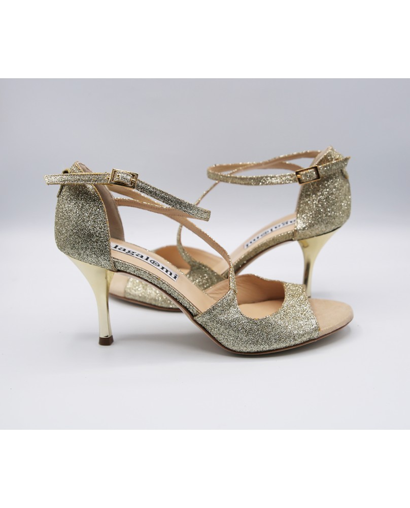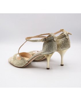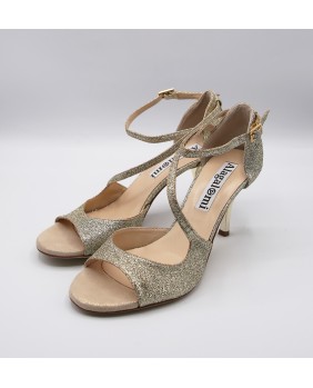 Closed back model with very original shape in platinum glitter leather. Ankle and diagonal foot straps, shinny gold heel and pump style make up this model very classic and elegant. Leather sole but available in suede.