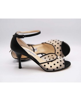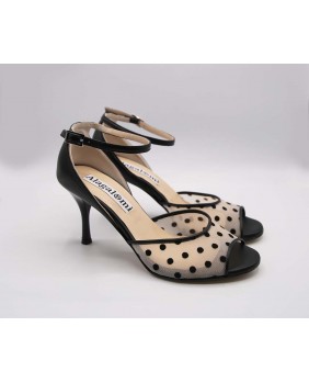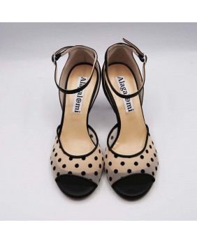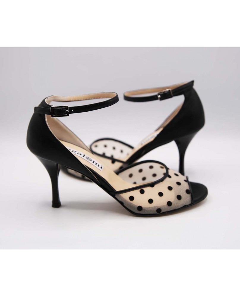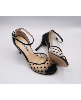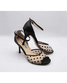 Closed-back cage design with pump shape style and translucent polka dot material at front. Made from black satinated leather, this style is classic and elegant with its shinny black heel for a unique look. Double-wrap ankle strap available and leather or suede sole.