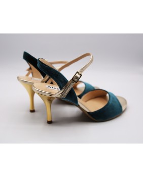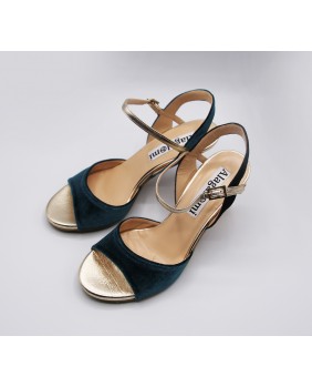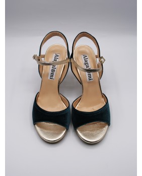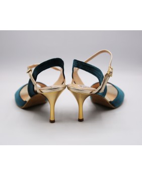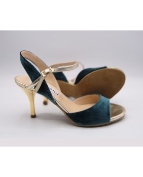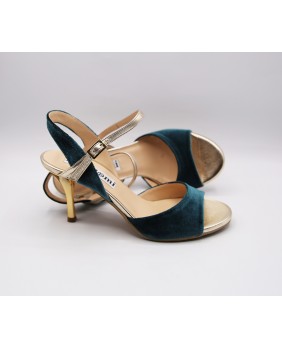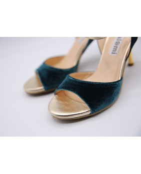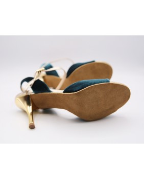 Beautiful Maia model in petrol velvet and gold leather. Open back and single strap all for this version but exists with a double strap and the back in gold leather. Gold mirror heel of course. This model also exists in burgundy velvet. Here suede sole but available in leather sole and all heels from 5 to 9 cm.
