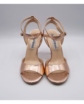 Beautiful Maia model in copper shinny leather and double strap on ankle. Open back with large side strap for this classic and elegant model with a mirrored copper heel. Available in suede or leather sole and in all heel from 5 to 9 cm.
