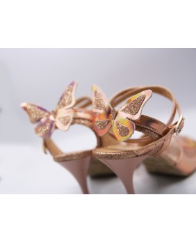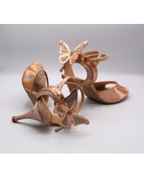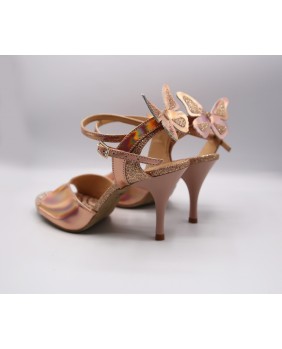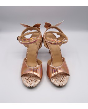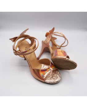 The brand's iconic model created by Dumitru Mihaica, the creator of Mono. Made of iridescent copper mirror polish and matching fine glitter, this style remains classic with a double-wrapped strap (either around the ankle or the foot) and a wide, bi-material back strap. This style is available in all colors and materials, and there are over 20 different polishes, including several mirror polishes. Four heel heights are available: 5 cm, 7 cm, 8 cm, and 9 cm, as well as three sole types: suede (the most flexible and can be colored), semi-rigid, and leather.