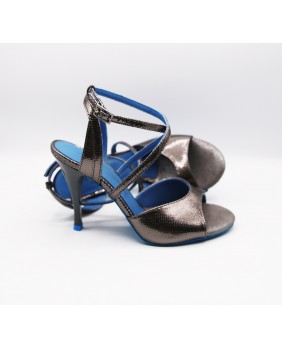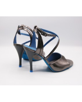 An original design by Dumitru Mihaica, the creator of Mono. Crafted in shiny charcoal leather, this style remains classic with a double-wrapped strap that crosses over the foot and an original double-thickness back strap. This model is lined with blue leather to match the suede sole and heel caps. It can be made in any color and material, and comes in hundreds of leathers, including over 20 different patent leathers, including several mirror-like patent leathers. Four heel heights are available: 5 cm, 7 cm, 8 cm, and 9 cm, as well as three sole types: suede (the softest and can be colored), semi-rigid, and leather.
