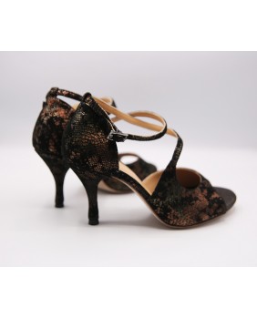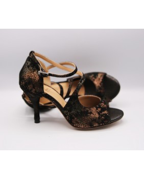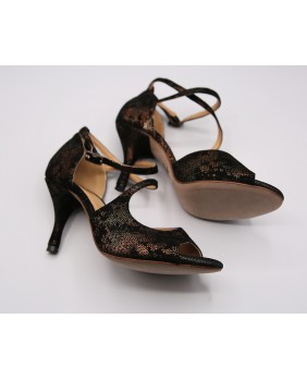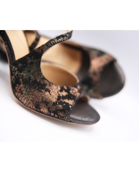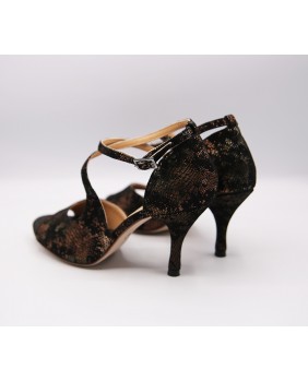 Crafted in black suede with bronze patterns, this model is very elegant with a closed cage and a strap attached to the front that crosses over the foot. This model is offered here with a suede-covered heel, but the heel can be black or bronze. It can be made in any color and material. Four heel heights are available: 5 cm, 7 cm, 8 cm, and 9 cm, as well as three sole types: suede (the softest and can be colored), semi-rigid, and leather.
