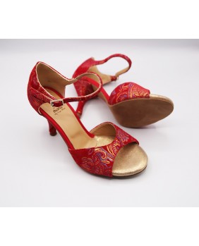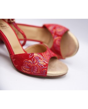 Crafted in red fabric with a gold print, this classic style features a closed cage and a short strap. This model also features a heel covered in the same fabric with matching red toecaps, one of Mono's signature details, as well as a small rhinestone on the strap buckle and a pointed back cage for added elegance. Four heel heights are available: 5 cm, 7 cm, 8 cm, and 9 cm, as well as three sole types: suede (the softest and available in colors), semi-rigid, and leather.