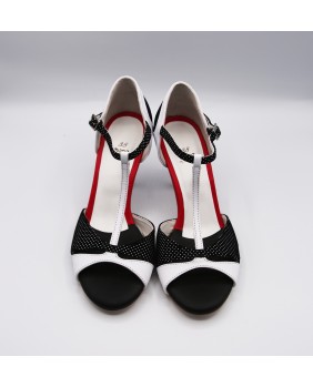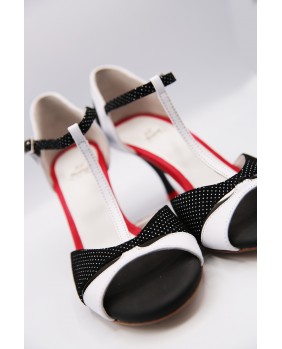 One of the brand's iconic models, created by Dumitru Mihaica, the creator of Mono. Made of white leather and black fabric with white polka dots, this style is very vintage and elegant, with a two-tone openwork front, a single-wrap T-strap, a red shoetap, and a closed back cage made of both colors. This model is available in all colors and materials, with hundreds of possibilities. Four heel heights are available: 5 cm, 7 cm, 8 cm, and 9 cm, as well as three sole types: suede (the softest and can be colored), semi-rigid, and leather.