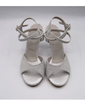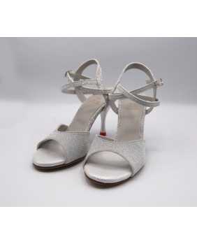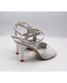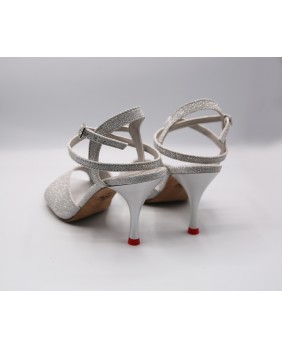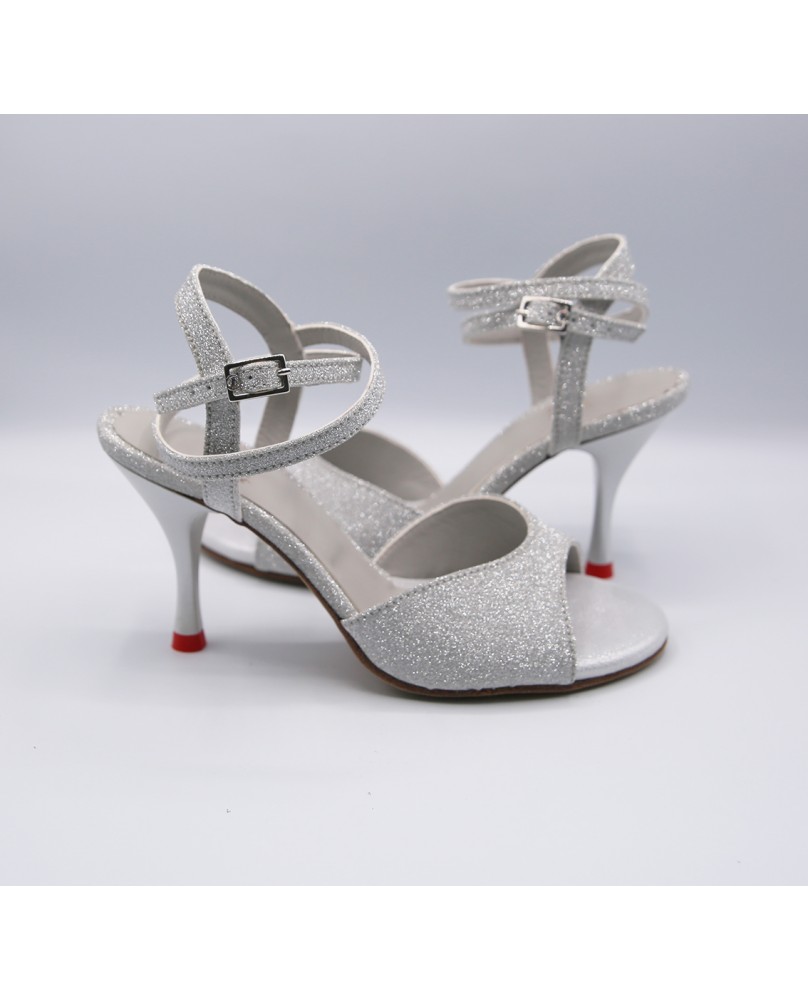 This model features one of the most classic shapes, with an open front, a double wraparound strap (either around the ankle or the foot), and a thin back strap. Made entirely of light silver sequined fabric, it features unusual details to set it apart: pink heel caps and a rhinestone on the strap buckle. This model can be made in any color and material. Four heel heights are available: 5 cm, 7 cm, 8 cm, and 9 cm, as well as three sole types: suede (the softest and can be colored), semi-rigid, and leather.