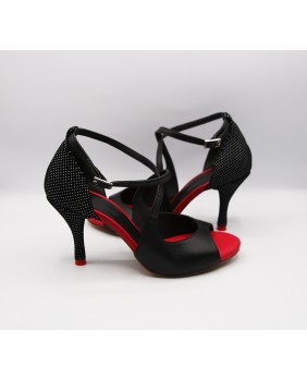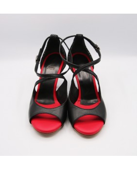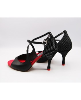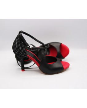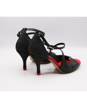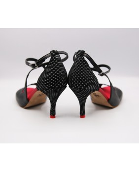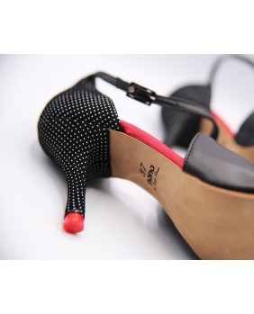 Crafted in white little polka dots black suede and satin black leather, this model is very elegant with a closed cage and a strap attached to the front that crosses over the foot. This model is offered here with a suede-covered heel, but the heel can be black or red. Red sole and heel caps are the final touches of elegance. It can be made in any color and material. Four heel heights are available: 5 cm, 7 cm, 8 cm, and 9 cm, as well as three sole types: suede (the softest and can be colored), semi-rigid, and leather.
