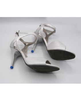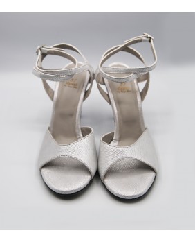 One of the brand's iconic models, created by Dumitru Mihaica, the creator of Mono. Made from silvery-white pearly leather, this style remains classic with a double wrap-around strap (either around the ankle or the foot) and a V-shaped back strap. This model is available in all colors and materials, and there are over 150 leathers, including 20 different patent leathers and several with mirrored finishes. Four heel heights are available: 5 cm, 7 cm, 8 cm, and 9 cm, as well as three sole types: suede (the softest and can be colored), semi-rigid, and leather.