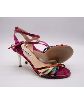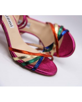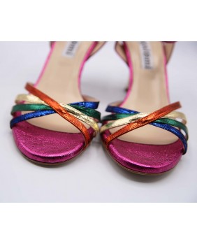 This is the "Estrella" model from Alagalomi, crafted in a blend of shiny leathers. Four crisscross straps make up the front, and the back features an open cage with a wide heel strap and a long double-wrap ankle strap. You can create your own style by mixing and matching colors. Available in a choice of leather or suede soles, and in all heel heights from 5 to 9 cm.