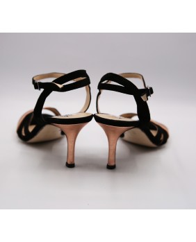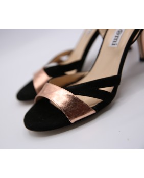 The "Jasmine" model by Alagalomi is crafted in black suede and copper leather with an open back, a simple ankle strap, a copper leather-covered heel, and distinctive toe straps in both materials. Available with a choice of leather or suede soles and in all heel heights from 5 to 9 cm.