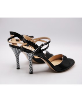 Beautiful Maia model in black and white patent leather with a black mesh print. Open back and a double-wrapped strap make this classic and elegant model stand out with a patent leather heel. Available in a choice of leather or suede soles, this model is available in all heel heights from 5 to 9 cm.