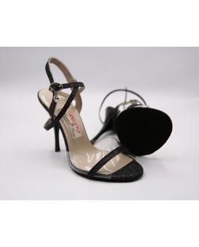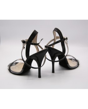 Model in black glittery fabric and transparent soft material that reveals the whole foot. Black sole and shinny black heel of special 9 cm on photos but available in 7 cm, 8 cm and normal 9 cm. This model is declined in all patent colors and transparent material and can be edged like our NT015 model.