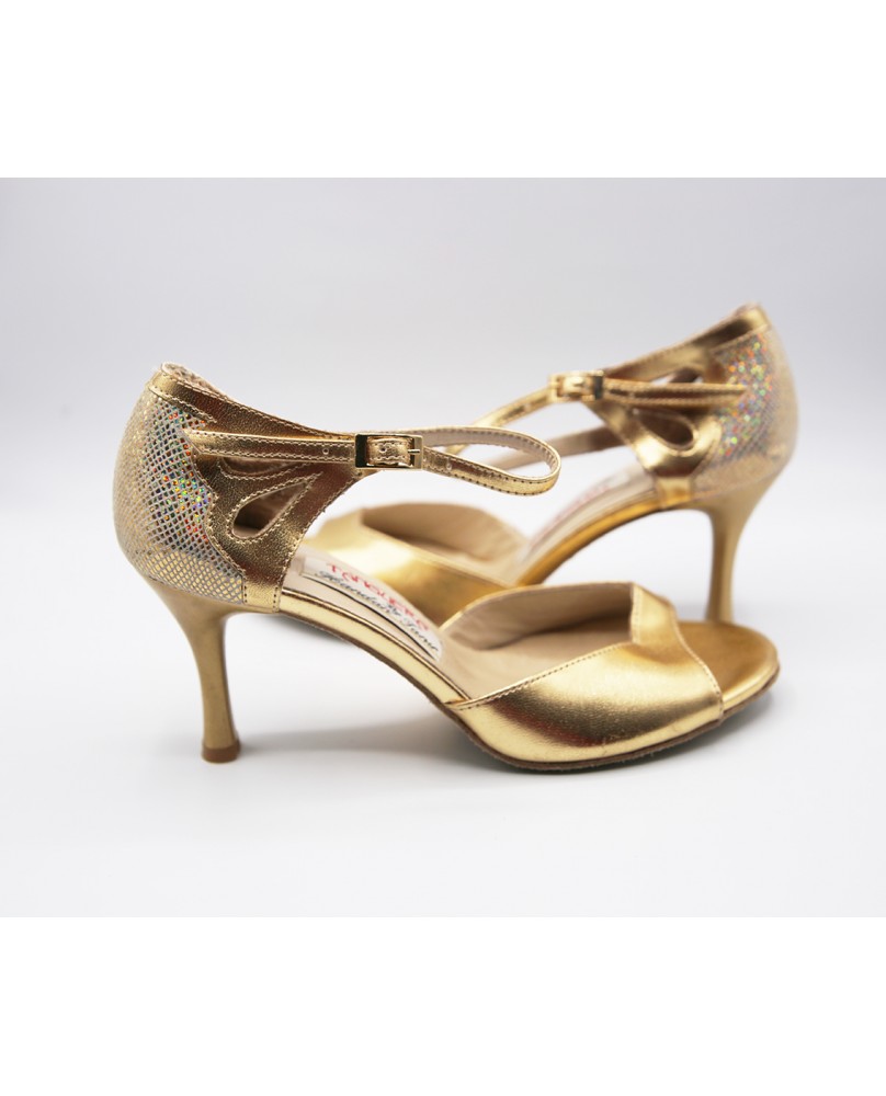 A very original closed-toe design with a flower-shaped cutout on the sides of the back cage, closed by a short strap. Matte gold leather and iridescent suede make up this pair, along with a small 7 cm matte gold heel. It's ideal for running and marathons. Light beige suede sole. Available in all heel heights and customizable in other colors and materials.