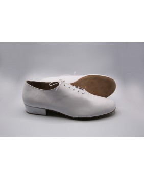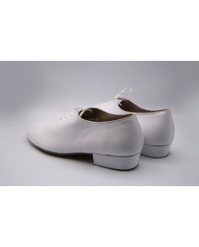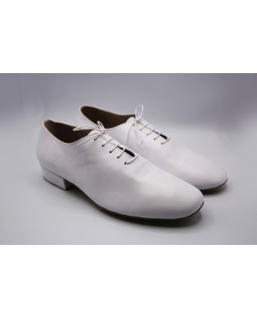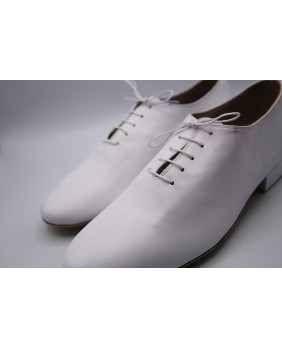 Men's model in white satin leather, made from a single piece of leather without any cutouts. The heel is 3 cm in the photo, but also available in 1.5 cm and 4 cm. Light beige suede sole. This model is available in all colors and materials to order.