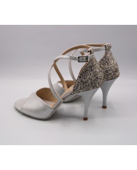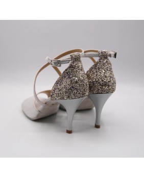 This model is made of light grey pearly leather and matching gradient sequins. It features a very classic shape with a closed cage, a long crossed strap extending from the top of the cage, and a matching light silver heel. This model is available in all colors and materials, with hundreds of possibilities. Four heel heights are available: 5 cm, 7 cm, 8 cm, and 9 cm, as well as three sole types: suede (the softest, which can be colored), semi-rigid, and leather.