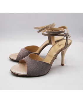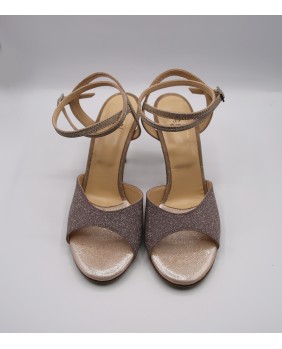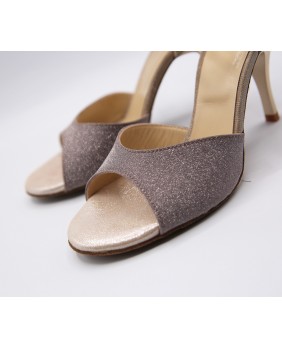 This model features one of the most classic shapes, with an open front, a double wraparound strap (either around the ankle or the foot), and a thin back strap. Made entirely of mink and golf sequined fabric, it features unusual details to set it apart such as matching sole and heel and a rhinestone on the strap buckle. This model can be made in any color and material. Four heel heights are available: 5 cm, 7 cm, 8 cm, and 9 cm, as well as three sole types: suede (the softest and can be colored), semi-rigid, and leather.