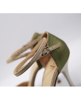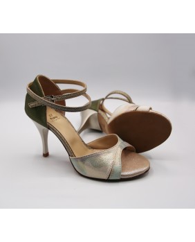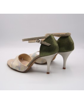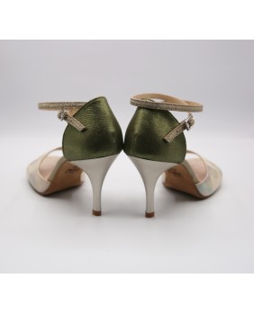 Crafted in light pearlescent printed leather and shiny olive green leather, this style is classic with a double wrap-around strap (either around the ankle or the foot), a closed back cage, and a unique cutout on the front. This style is available in all colors and materials, with hundreds of possibilities. Four heel heights are available: 5 cm, 7 cm, 8 cm, and 9 cm, as well as three sole types: suede (the softest and most customizable), semi-rigid, and leather.