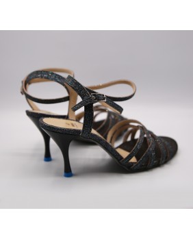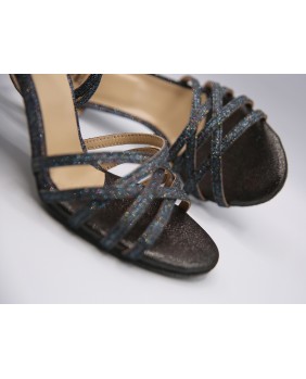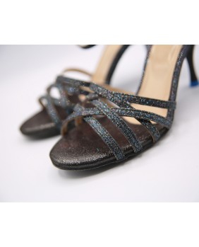 The MF600BA model is a classic ballroom dance shoe. Made of bluish-gray sequins, it features an open back, ideal for Argentine tango, and a crossover strap. A shiny black heel and blue toe cap complete the shoe beautifully. It is available in all colors and materials. Four heel heights are available: 5 cm, 7 cm, 8 cm, and 9 cm, as well as three types of soles: suede (the most flexible and colorable), semi-rigid, and leather.