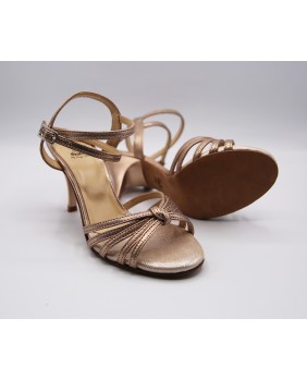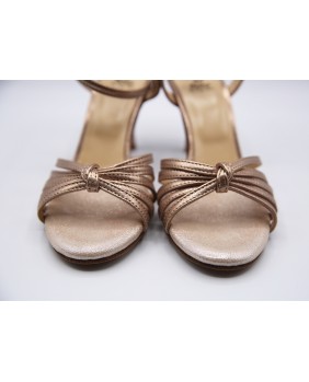 The model MF508N is a classical ballroom shape model. This version is made of mat copper leather, it has a open back and crossed strap on the toes. It can be manufactured in all colors and materials. Four heel heights are available: 5 cm, 7 cm, 8 cm, and 9 cm, as well as three sole types: suede (the most flexible and can be colored), semi-rigid, and leather.