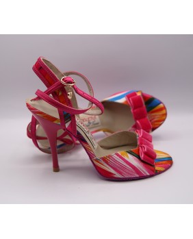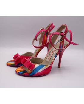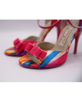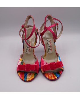 New colorful model made mostly of pink and red printed satin ith matching sole and heel in special 9 cm heel on photos but exists in 7 cm (red), 8 cm, 9 cm and special 9 cm. Very original and elegant new model. Large back strap bordered with pink satin and pink velvet bow on the front part.