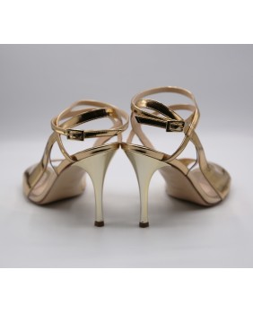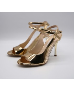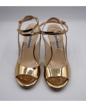 The Diva model is an original and exclusive style from the Alagalomi brand. Beautiful, elegant, and very feminine, it is available here in shinny patent gold leather and PVC on the side with an original cutout. The mirrored gold heel enhances this model.