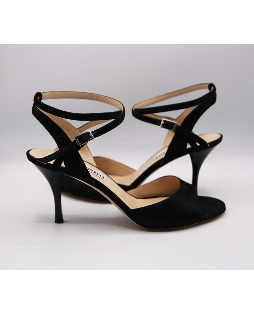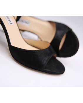 Beautiful Maia model in deep black glossy leather, a little shinny and elegant material. Open back and double-wrap strap for this classic and timeless model with a shinny black heel.