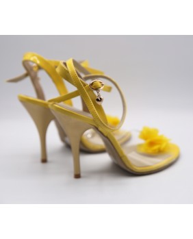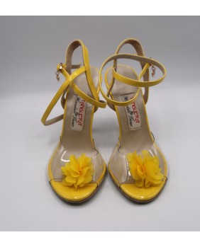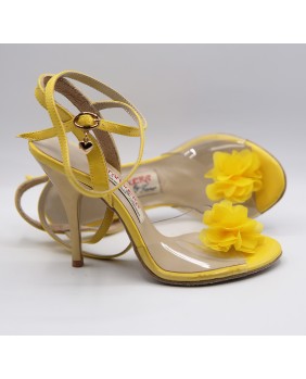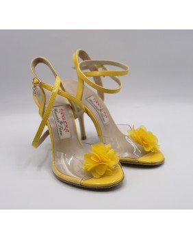 Model in yellow patent and transparent soft material that reveals the whole foot decorated with a fabric flower. Light beige sole and mat gold heel of special 9 cm on photos but available in 7 cm, 8 cm and normal 9 cm. This model is declined in all patent colors and transparent material and can be edged like our NT015 model.