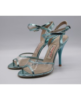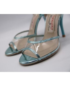 Nice nude model in transparent material ans mirrored turquoise patent with a classical shape open at the front and the back with double position strap. Nice matching turquoise heel and light sole. This model can be made in any color or material except large glitter.