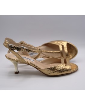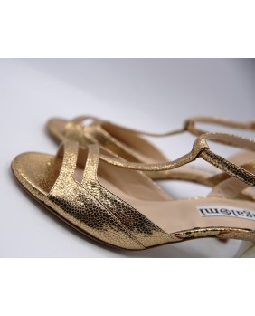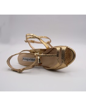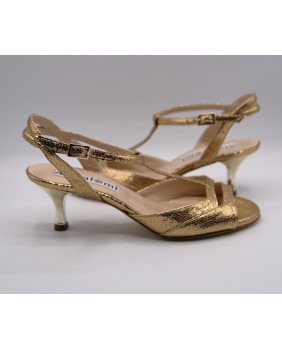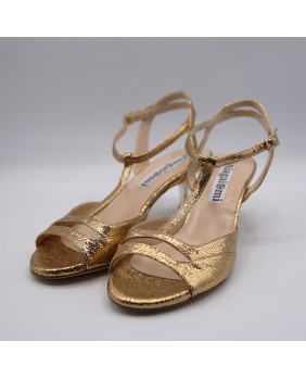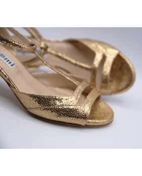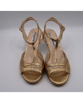 The "Alma" model from Alagalomi is made of antique gold leather and offers a very original shape. It features an open back with a double heel strap. The front also features two overlapping straps with a thin cutout at the toes, and the heel is shinny mirrored gold. Available in a choice of leather or suede soles and in all heel heights from 5 to 9 cm.