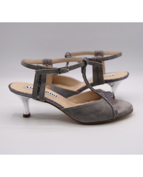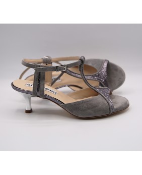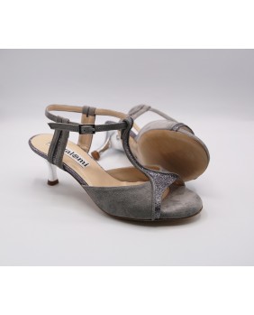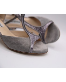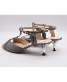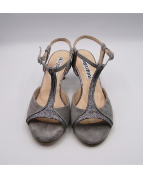 This open back model of Alagalomi is made of a mix of grey suede and dark silver glitter. It offers a T strap in glitter that ends on the front part, a back strap made of two intertwined straps, a shinny mirrored silver heel and leather sole. Available in all heights and with a suede sole too.
