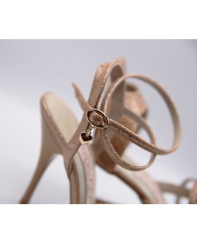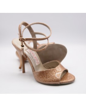 Lovely and elegant glittery beige coppery patent model with moka heel and light sole. A new material very original that is also available in red, silver, gold, turquoise, light green and dark pink. Double position strap either around the foot or around the ankle. Available in 27 different patent colors and 6 sole colors.