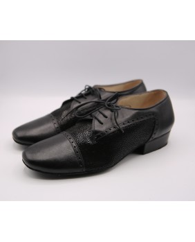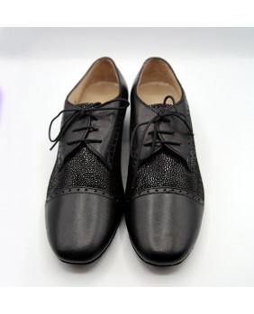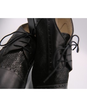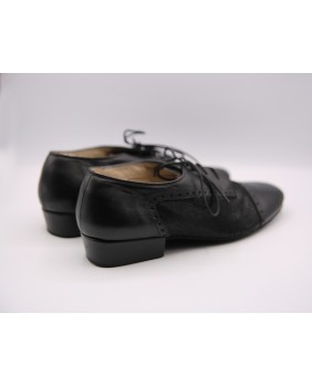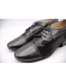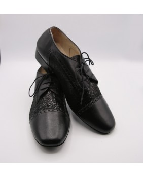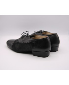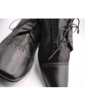Very elegant retro style model in black nappa leather and matching printed suede made with a 3 cm heel but available in 1.5 cm and 4 cm heels. The contrast between this classic rockabilly shape, the perforated leather and the modern print of the suede gives this model a unique style.