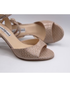 Beautiful Maia model in gold liberty printed beige suede. A very original material with beautiful reflections. Open back and double-wrap strap for this classic and elegant model with a mirrored gold heel.