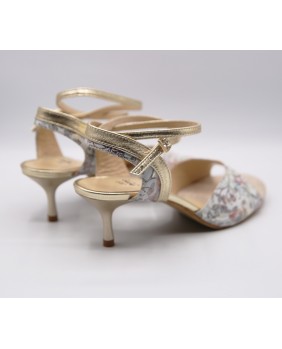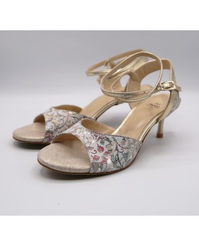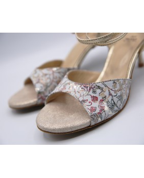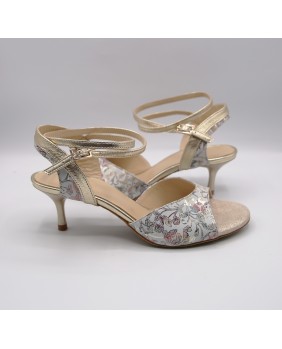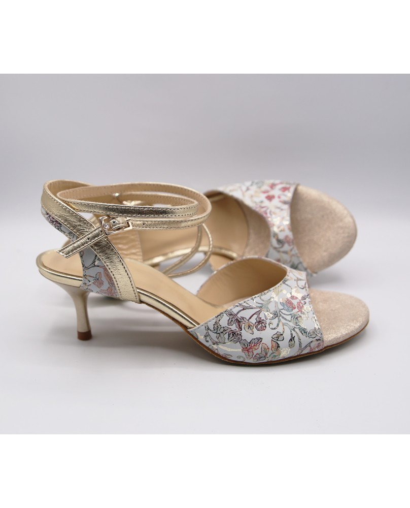 This model is made of gold printed leather and mat gold leather with a classic shape featuring an open front, a double-wrapped strap (either around the ankle or the foot), and a wide, both colors back strap. It can be made in any color and material, and there are hundreds of possibilities. Heel is 5 cm on photos but four heel heights are available: 5 cm, 7 cm, 8 cm, and 9 cm, as well as three sole types: suede (the softest and can be colored), semi-rigid, and leather.