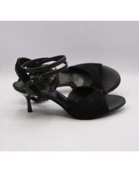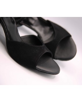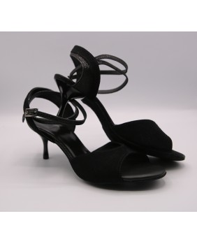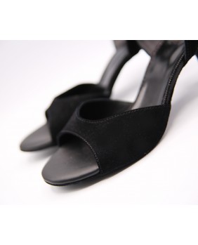 This model is made of black suede and matching black glitter with a classic shape featuring an open front, a double-wrapped strap (either around the ankle or the foot), and a wide, both materials back strap. It can be made in any color and material, and there are hundreds of possibilities. Heel is 5 cm on photos but four heel heights are available: 5 cm, 7 cm, 8 cm, and 9 cm, as well as three sole types: suede (the softest and can be colored), semi-rigid, and leather.