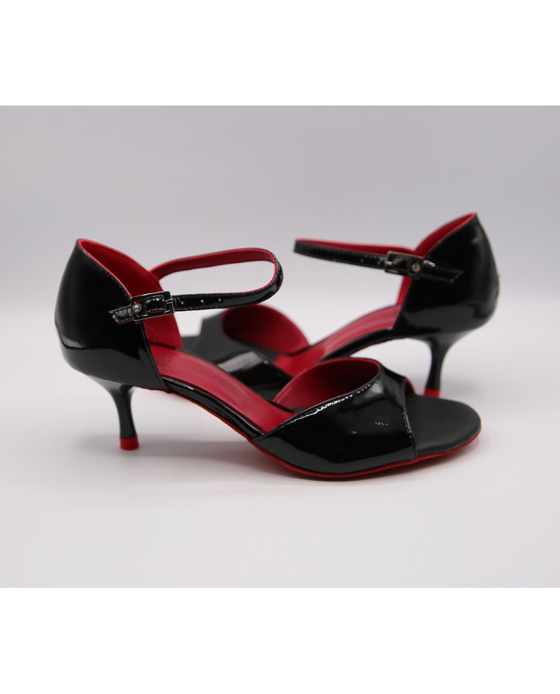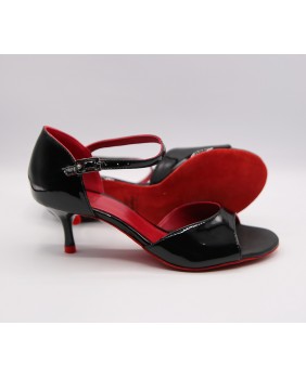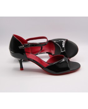 The MF021 model features a caged heel at the back, an open front, and a short ankle strap. Made from black patent and red leather, it has a matching shinny small black heel. This model is covered inside by red leather and has a matching red sole and red heel tap. Available in all colors and materials. Four heel heights are available: 5 cm, 7 cm, 8 cm, and 9 cm, as well as three sole types: suede (the softest and most customizable), semi-rigid, and leather.
