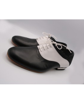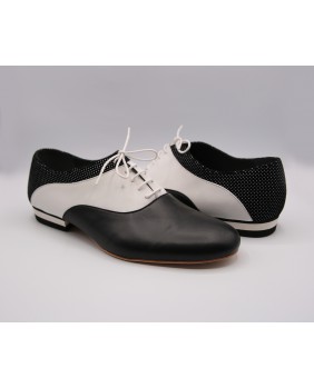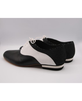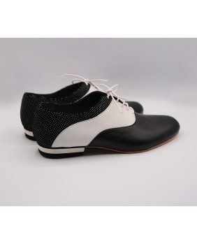 This model has a very original design with two long cuts all along the shoe. Made of white poka dots black suede, white and black leather, it also features ablack and white a 2.5 cm black heel. Full black leather inside for more elegance. It is available in all colors and materials with three sole types: suede (the softest and available in different colors), semi-rigid, and leather.
