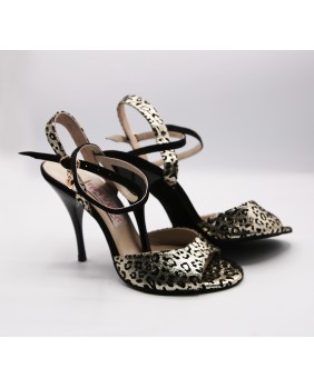 Modèle en daim noir et daim imprimé léopard doré à l'avant et sur la bride arrière. Bride double position soit sur le pied soit autour de la cheville. Talon noir de 9 cm sur les photos mais existe en 7 cm large, 8 cm, 9 cm et 9 cm spécial.