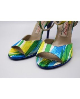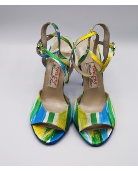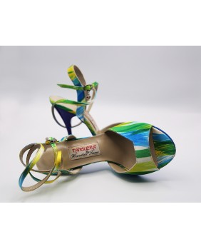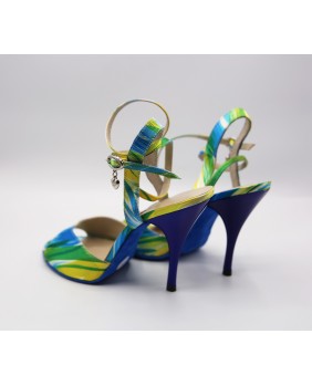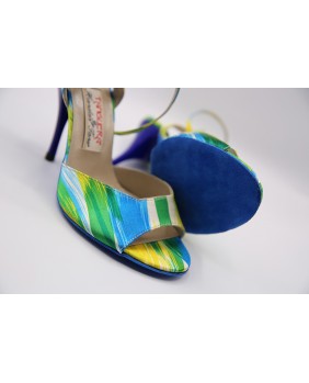 Nouveau modèle en tissu imprimé très coloré avec des tons de bleu, jaune et vert. Talon et semelle bleus assortis bleu imperial. Longue bride double position. Talon de 9 cm cambrure prononcée sur les photos mais existe en 7 cm, 8 cm, 9 cm et 9 cm (spécial).