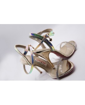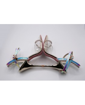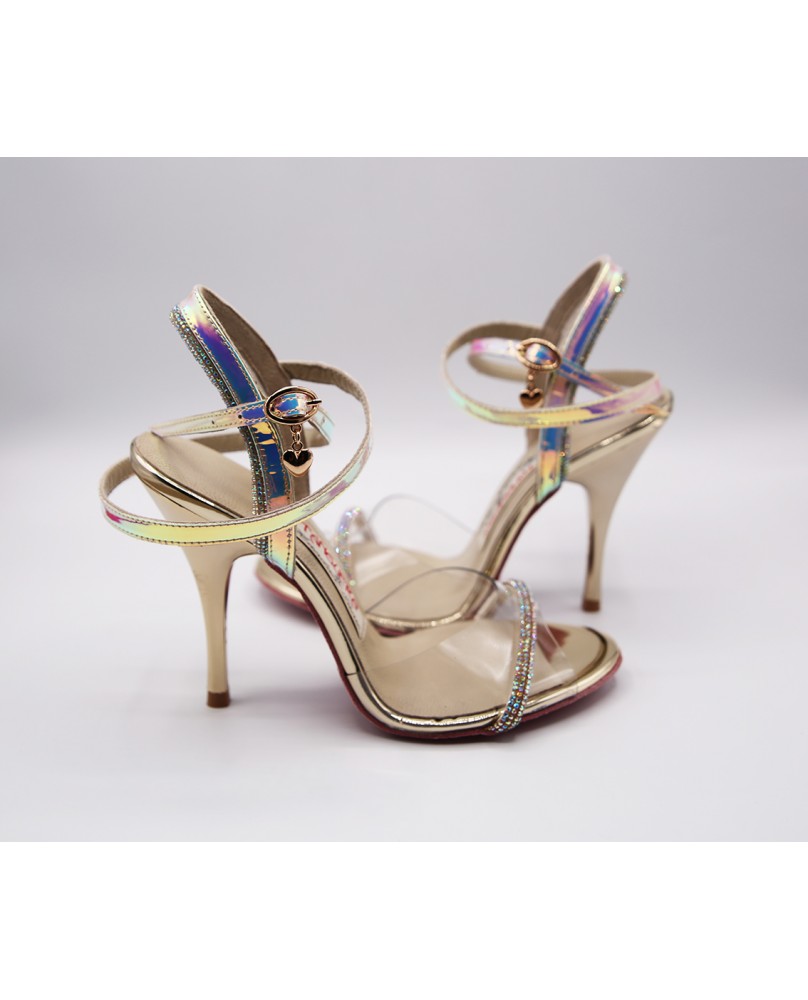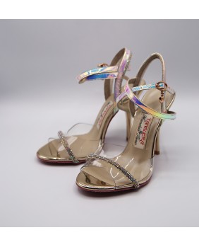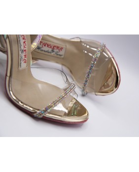Modèle en vernis irisé et matériau souple transparent qui laisse apparaître l'ensemble du pied. Bande de strass à l'avant et le long de la bride arrière. Semelle rose claire et talon doré miroir de 9 cm spécial (Cambrure prononcée) sur les photos mais existe en 7 cm, 8 cm et 9 cm. Ce modèle peut se décliner dans toutes les couleurs de vernis et le matériau transparent peut être bordé comme notre modèle NT015.
