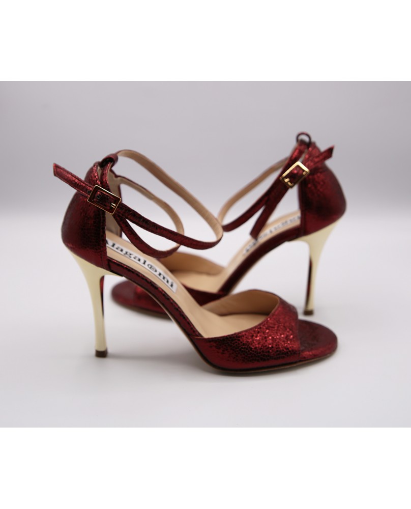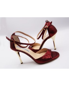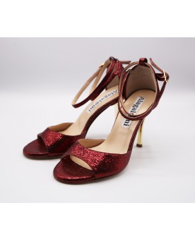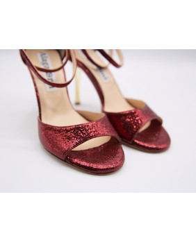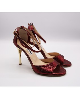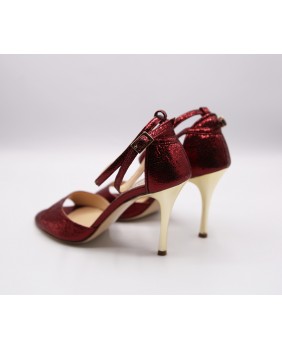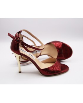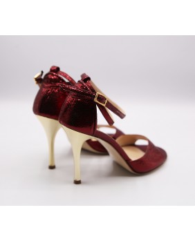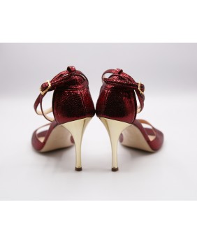 Modèle à cage fermée à l'arrière avec une bride longue en superposition sur la cage. Fabriqué en cuir bordeaux brillant, ce modèle est classique et élégant avec son talon doré miroir. Bride double tour cheville et semelle en cuir.