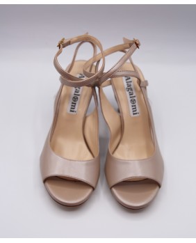 Le modèle Diva est une forme originale et exclusive de la marque Alagalomi. Magnifique, élégant et très "femme", il est ici décliné en cuir cuivré nacré beige clair et PVC sur le côté avec une découpe originale. Le talon couvert du même cuir sublime ce modèle.