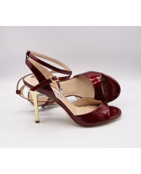 Magnifique modèle Maia en vernis nacré bordeaux. Un matériau très original avec de beaux reflets. Arrière ouvert et bride double tour pour ce modèle classique et élégant avec un talon doré miroir.